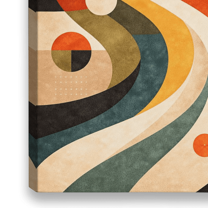 A bold mid-century inspired abstract composition where flowing retro waves and geometric circles create a rhythmic visual movement. Warm oranges, deep teal and earthy neutrals evoke nostalgic 60s–70s design aesthetics. Perfect for adding energy and character to a modern living room, creative workspace, or stylish retro interior.