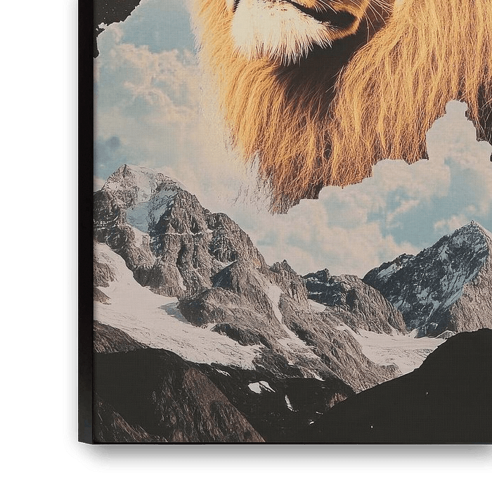 This retro collage shows the head of a lion, imposingly enthroned in the sky above mountains and a moon. The interplay of geometric shapes and nostalgic colour tone gives the image a unique vintage character. Ideal as an eye-catching poster for lovers of retro design and powerful animal art.