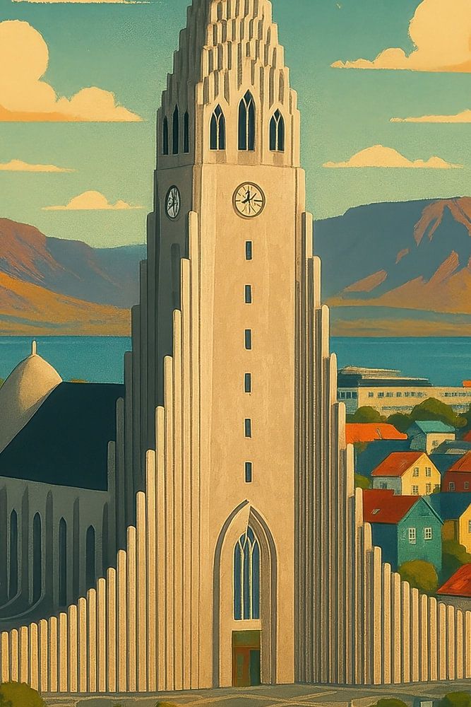 A fascinating architectural jewel rises majestically above the colourful little houses of Reykjavík. The striking silhouette of the church radiates calm and elegance, while the soft colours of the sky and the surrounding mountains create a harmonious atmosphere. Ideal for the living room, this work of art brings a piece of Scandinavian charm into your home.