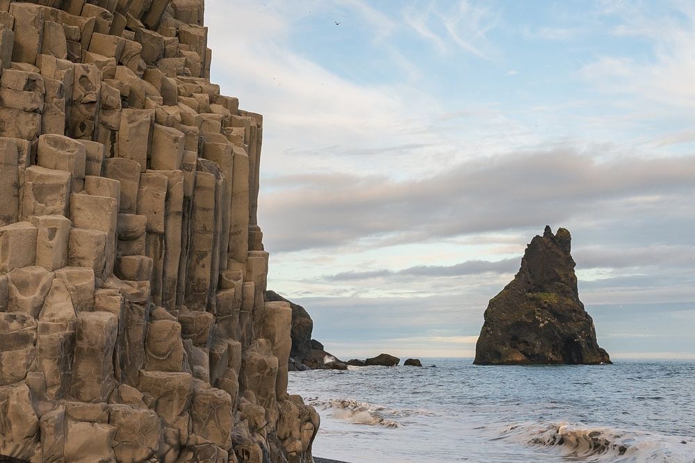 Reynisfjara black beach is Iceland is famous for the rocks in the water and the volcanic basalt columns.