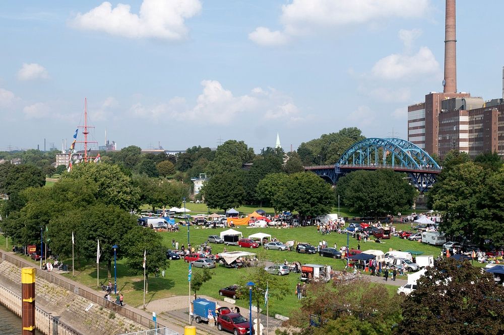 Duisburg Nordrhein-Westfalen Germany Hermann Wenzel power station. Along the banks of the Rhine in Rheinwiese Mühlenweide (Park) a Saturday market takes place. Duisburg Nordrhein-Westfalen Deutschland Kraftwerk Hermann Wenzel. Entlang des Rheinufers in der Rheinwiese Mühlenweide (Park) findet am Samstag ein Markt statt.
