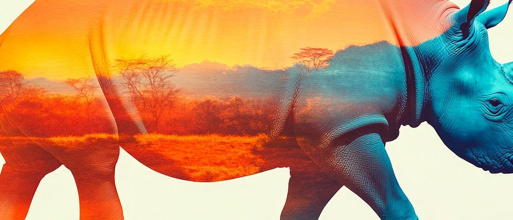 A majestic rhinoceros filled with a breathtaking sunset creates the impression of freedom and adventure. The harmonious shades of orange and blue create a calming atmosphere. This artwork is ideal for the living room, where it can stimulate conversation and inspire the imagination.
