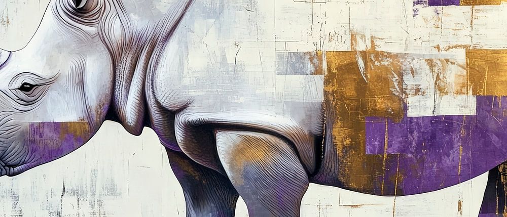 A majestic rhinoceros presents itself in powerful, layered colours that give it a modern touch. The harmonious combination of white and purple, interspersed with golden accents, immediately catches the eye. This work of art brings a dynamic energy to any living room and becomes a talking point for guests.