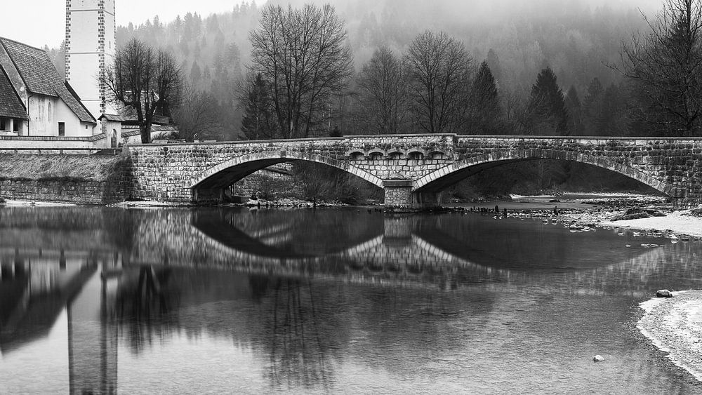 The bridge at Ribcev Laz, black and white, Lake Bohinje, Slovenia