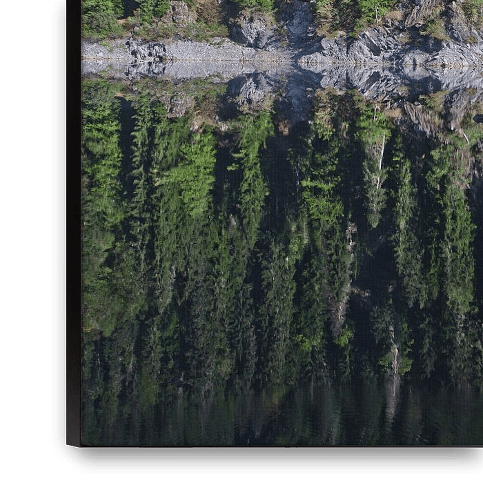 About ‘Rich green spruce forest wall to the shore of a mountain lake, the trees are reflected in the water.’ by Michael Semenov