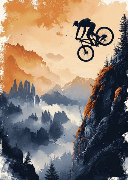 A striking artistic illustration of a mountain biker riding toward a dramatic red sun, framed by towering peaks and dark pine forests. This artwork symbolizes freedom, courage, and the journey into the unknown, making it a bold statement piece for adventure lovers and modern wall decor.