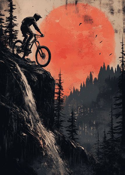 A striking artistic illustration of a mountain biker riding toward a dramatic red sun, framed by towering peaks and dark pine forests. This artwork symbolizes freedom, courage, and the journey into the unknown, making it a bold statement piece for adventure lovers and modern wall decor.