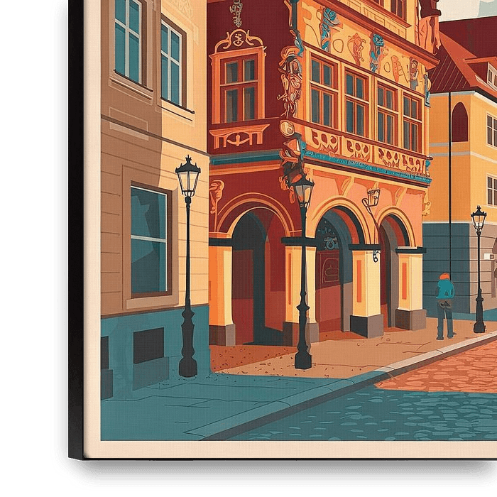 Unique architectural splendour unfolds along the picturesque canal, where vibrant colours and ornate details bring Riga's historic backdrop to life. The elegantly curved façade in the foreground radiates an inviting atmosphere, while the clouds gently drift over the horizon, conjuring up the image of a charming European city.