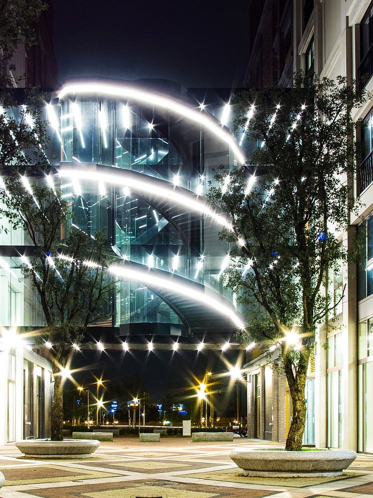 In Utrecht Leidsche Rijn, some very nice places have been built and for the photographer, Rigastraat is a challenge to get a good shot. A matter of patience especially, as there are quite often vans and cars parked on the corner. This time I was lucky and with a long shutter speed I could even capture the light streaks of passing traffic in the background. The beautifully lit spiral staircase is a real eye-catcher on this street.