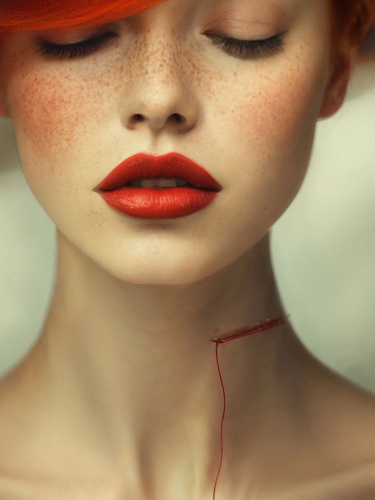 At first glance, this looks like a classic fashion portrait: a young woman with red hair and a big white hat, eyes closed in silence, lips stained red. But those who look longer see the thin red line across her throat - a subtle but inescapable sign of violence.