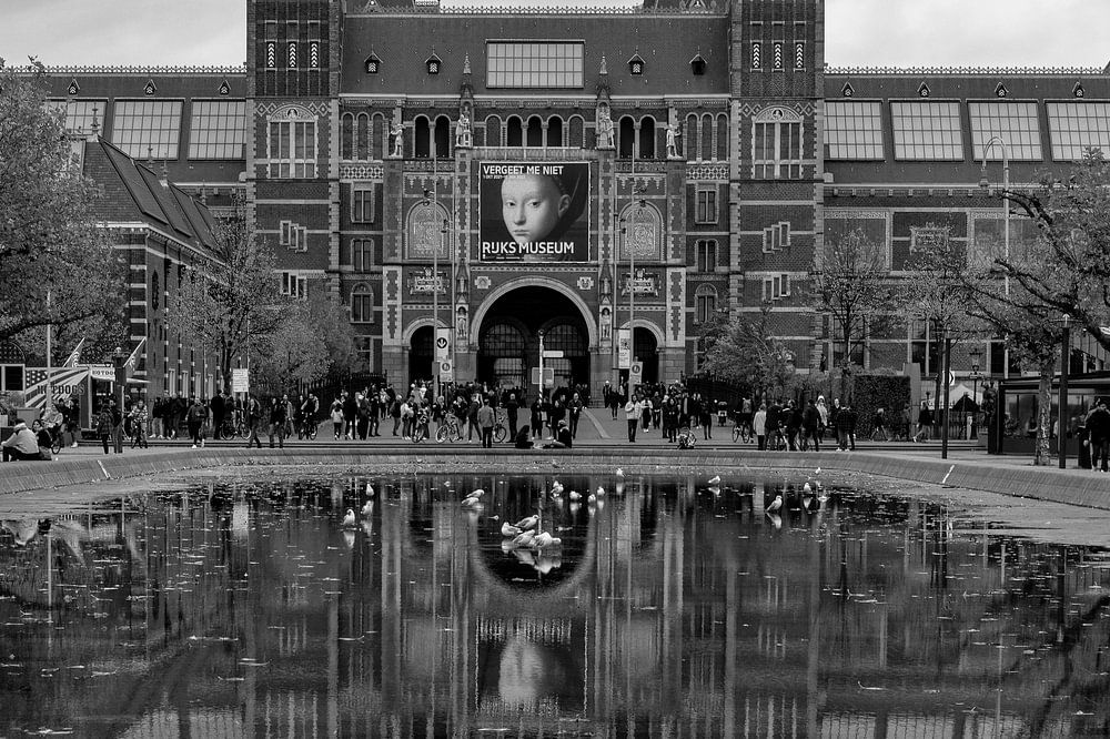 This work shows the Rijksmuseum in Amsterdam, seen from the Museumplein. In the foreground is a large puddle of rainwater in which the Rijksmuseum is beautifully reflected.