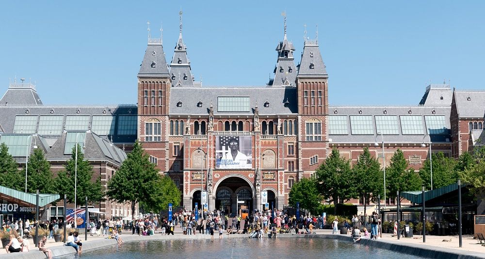 Amsterdam The Netherlands Rijksmuseum on the Museumplein on a sunny spring day. pond, pond,