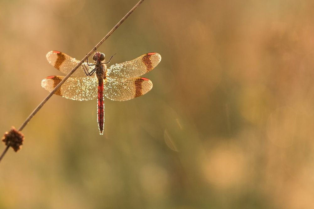 The banded dragonfly is a small heidelibel measuring around 28-35 mm. Its most distinctive feature is the dark brown band that runs across the top half of its wings. This is what distinguishes the banded dragonfly from other hedgehogs. The abdomen of adult males is deep red and the pterostigmas are red. The abdomen of the females is yellow and the pterostigmas are cream in color. The legs of both male and female are black.
