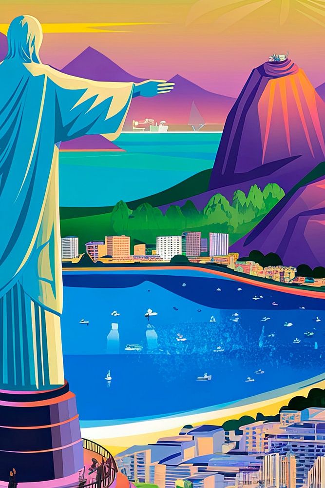 A luminous panorama unfolds, framing the majestic statue of Christ in brilliant blue. Gentle hills and golden sunbeams are reflected in the glistening water, while the colourful buildings lie beneath a pastel sky. Rio de Janeiro radiates joie de vivre and energy, nestled between the mountains and the sea, a true festival of colour.