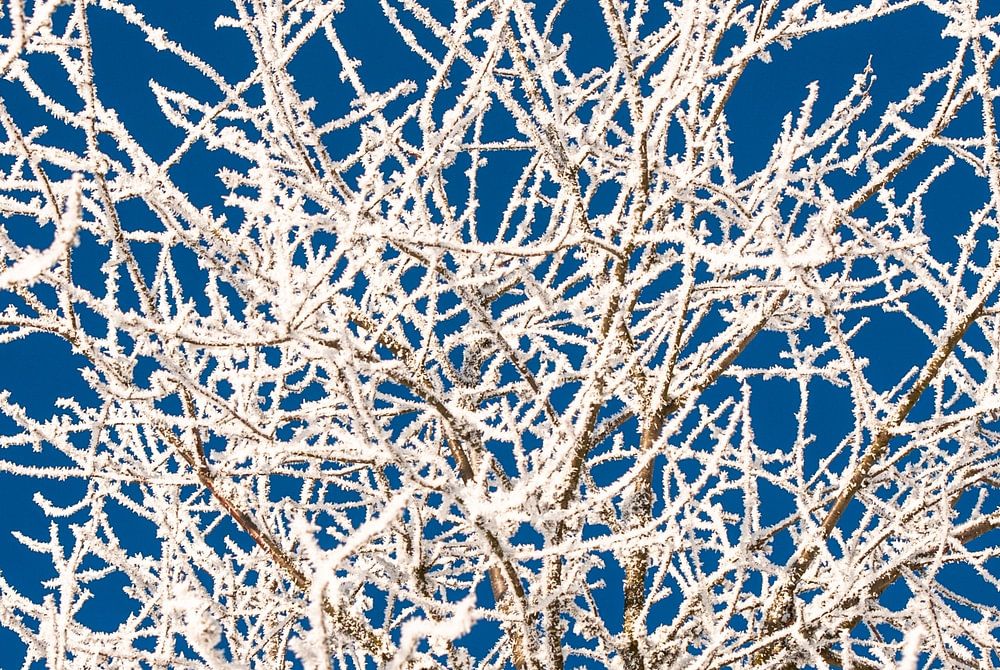 The bare winter branches covered with white frost stand out beautifully against the cobalt blue winter sky.