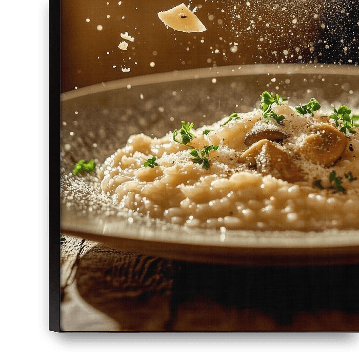 This is an artistic moment of culinary art: A hand sprinkling delicate cheese flakes over a creamy risotto while the fine particles dance in the air. The soft colours and inviting atmosphere make this picture the perfect eye-catcher for the kitchen, where taste and passion meet.