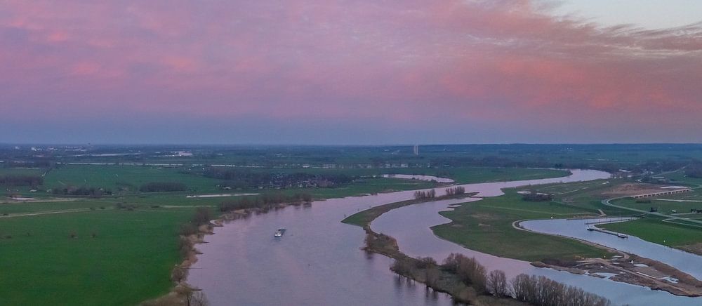 Panoramic aerial view on the river IJssel near the Hanseatic League city Kampen during a springtime sunset in Overijssel. The flow of the river is leading towards the colorful clouds in the sky cuasted by the setting sun at the end of a beautiful springtime day.