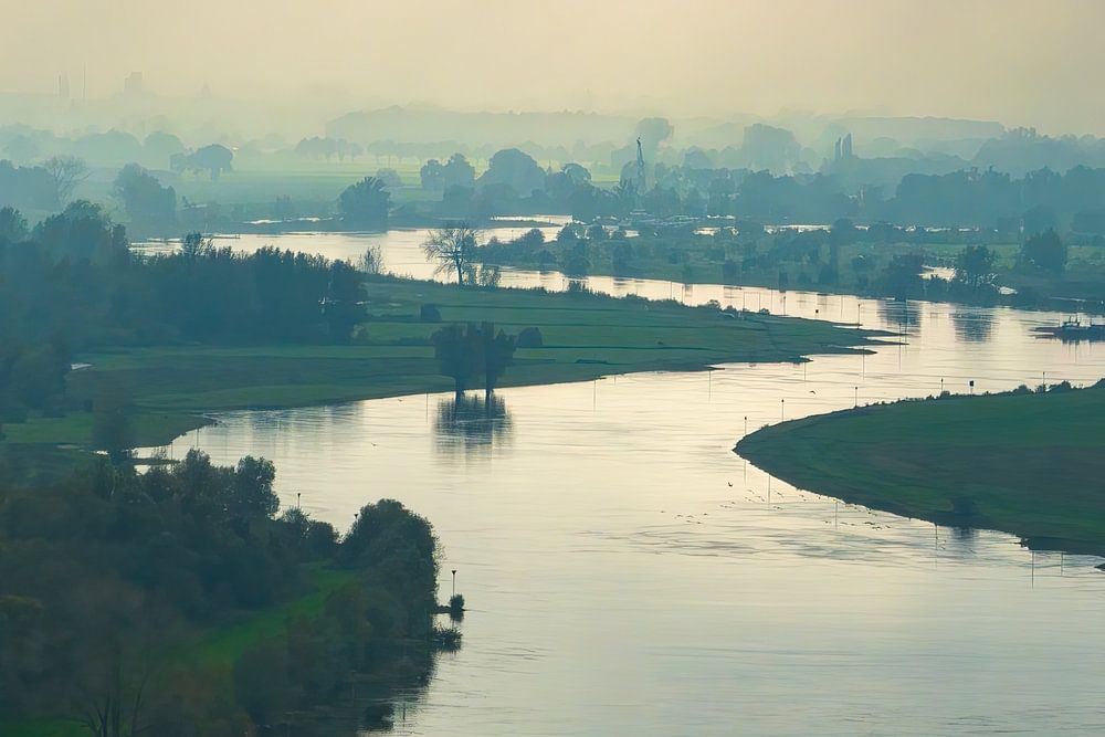 IJssel river meandering through the landscape during a hazy autumn day between Wijhe and Zwolle seen from above.