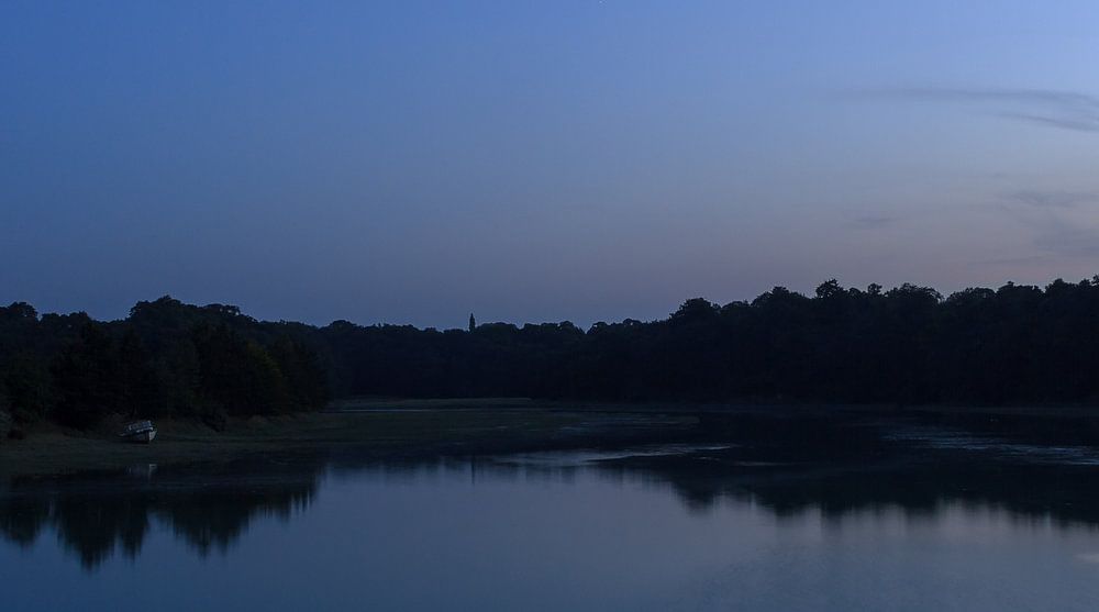 Prachtige donkere panoramische opname van een landschap met een bos en een halve maan na zonsondergang aan rivier de arguenon bij Saint-Malo in Bretagne, Frankrijk in de zomer