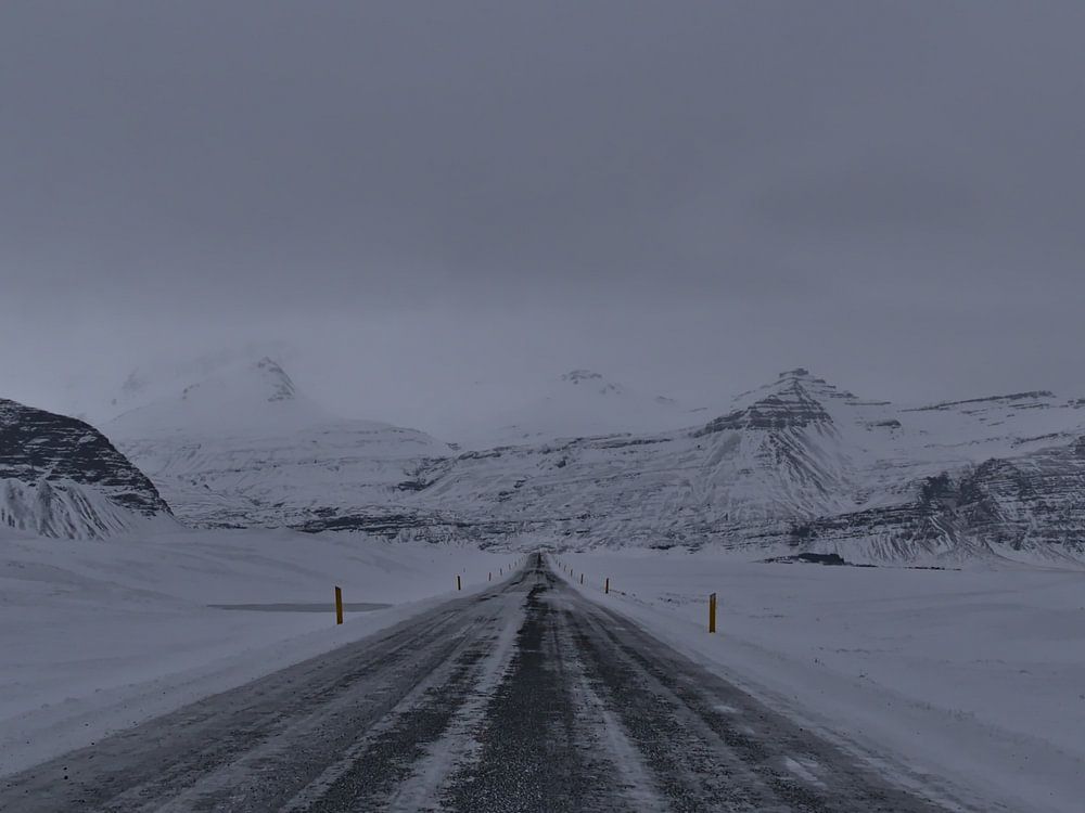 View over the icy ring road (Route 1) in the south of Iceland near the Vatnajökull National Park with snow covered meadows and rugged mountains disappearing in the low clouds.