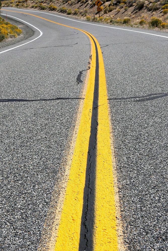 Yellow stripes on an endless road from Pahrump to June Lake in the state of California in the United States (North America, USA)