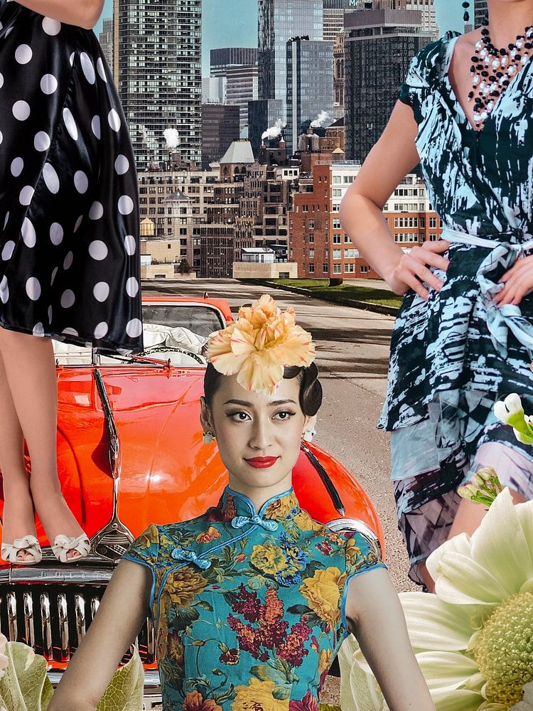 This collage screams: summer, adventure, power woman! Cheerful collage on light blue background with colorful flowers and women. A humorous, absurd and surrealistic collage that makes you happy. Three tough women on a roadtrip. Summery coral red.