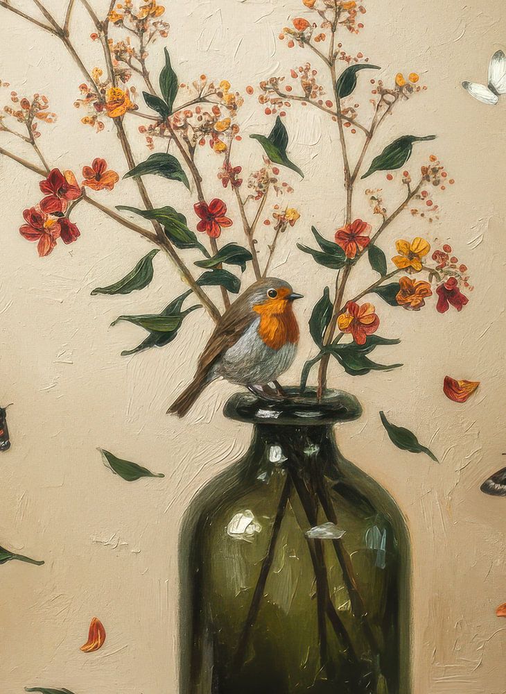 Oil painting of a robin on a green glass vase, surrounded by blossom branches and butterflies. A calm and atmospheric still life that brings warmth and nature into your home. Perfect for those who love understated, timeless wall decoration.