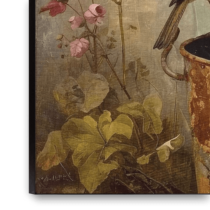 A robin perches briefly on the rim of a rusty bucket. A colourful work of art in earth tones, where rust brown is beautifully balanced with taupe, beige green and blue. A nostalgic work of art with a vintage look.