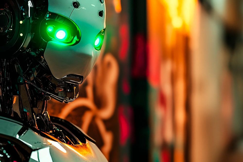 In the twilight of the urban landscape, a futuristic figure comes to life. With glowing green eyes and a shiny metal body, the robot radiates an aura of mystery. Ideal for creative minds looking for inspiration in the office or for a modern living room that combines technology and art.