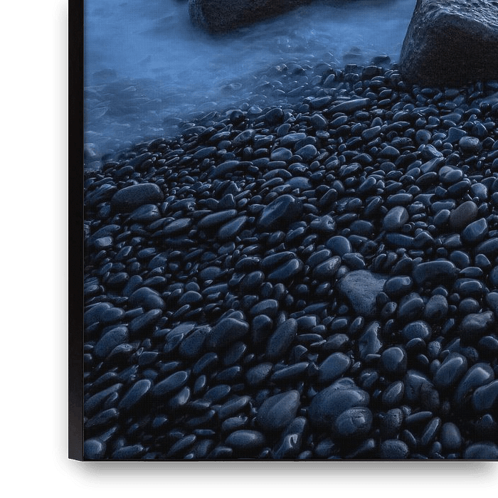 The sun had just set and the light gave a beautiful blue colour, armed with tripod I was able to apply a long exposure time, such that the sea water lay like a velvet blanket around the stones. This gives a very calm feeling . The square format enhances the calm and zen effect of this shot. The wet stones make it not just become a black…