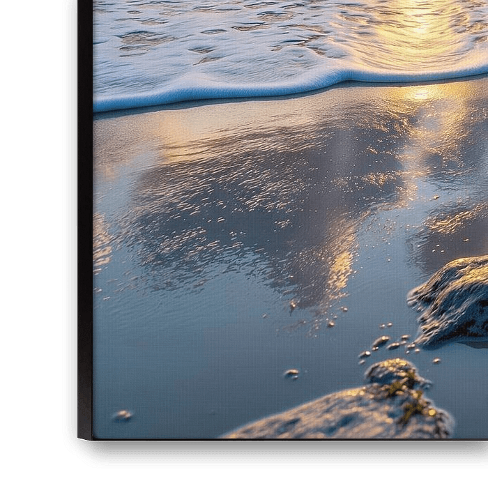 Coastal scene: Waves meet a rocky shoreline with lush vegetation, illuminated by a vibrant sunset.