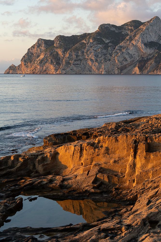 The sun rises over a calm seascape and bathes the rocky coastline in golden light. In the distance, the Peñón de Ifach Natural Park rises out of the sea and catches the eye. Soft clouds floating in the sky form a harmonious contrast to the jagged rock formations of the cliffs of Calpe and Benissa. The smooth water reflects the soft…