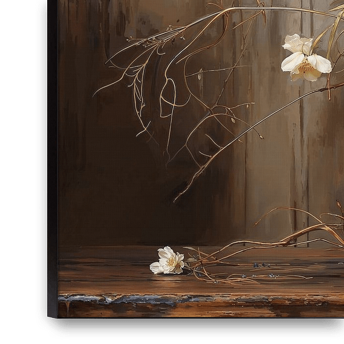 In this enchanting painting, romance comes alive through the graceful composition of two simple ceramic vases, which proudly occupy the centre of the picture. The vases, with soft hues, exude timeless elegance. Inside rests a lush bouquet of blue and white flowers, carefully arranged with an artistic sensibility.