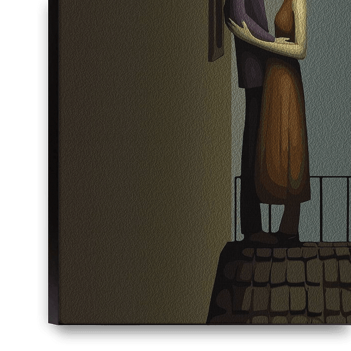 Buy this painting Romantic Moonlight Balcony – Vintage Noir Love by Ramy Salah Hefny as a reproduction on canvas, ArtFrame, poster and wallpaper, printed on demand in high quality.
