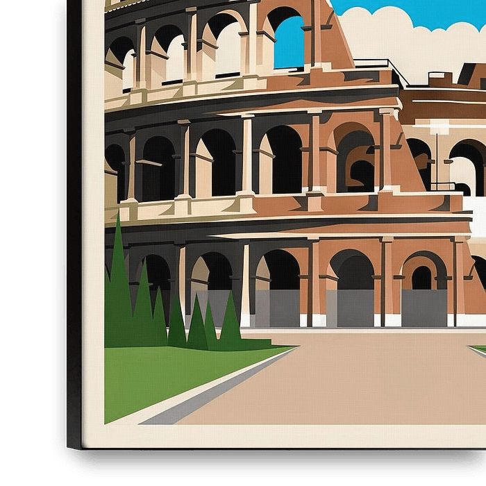 The ancient Colosseum rises majestically with its characteristic oval shape and elegant arches, surrounded by a bright blue sky. The outstanding architecture tells stories of times gone by, while gentle, green lawns line the path to this historic landmark. A visual feast for anyone who dares to travel back in time to Rome!
