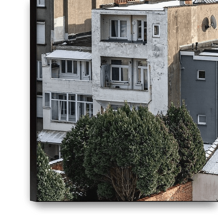From high perspective, a pattern of roofs and terraces unfolds, covered by a thin layer of snow. Jette appears here as an abstract set of shapes and volumes, in which the everyday is temporarily stripped of detail. The white layer brings coherence and rhythm to the urban fabric.
