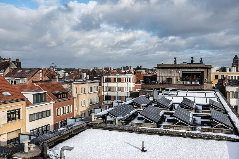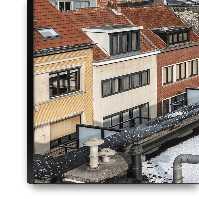 From high perspective, a pattern of roofs and terraces unfolds, covered by a thin layer of snow. Jette appears here as an abstract set of shapes and volumes, in which the everyday is temporarily stripped of detail. The white layer brings coherence and rhythm to the urban fabric.