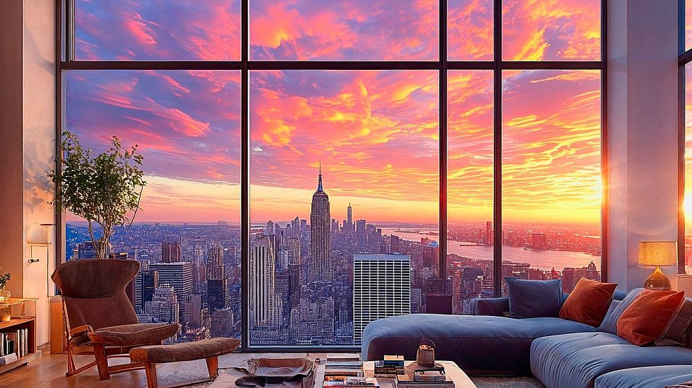 A cosy modern living room with large floor-to-ceiling windows offering breathtaking views of the sunset over New York City. In the background, the city skyline is visible with iconic skyscrapers including the Empire State Building. The overall atmosphere is inviting, warm and serene, capturing the essence of a perfect evening at home.