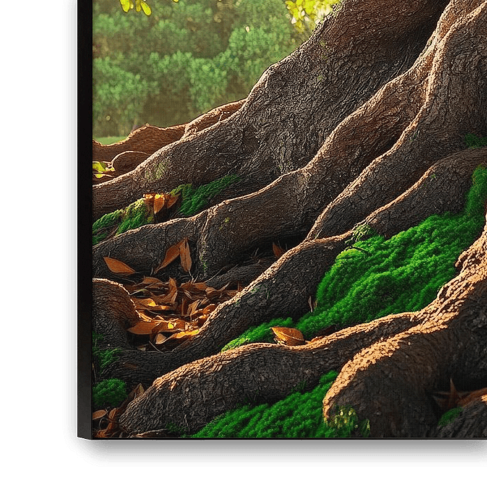 Strong, rooted branches spread out majestically, while soft light caresses the green bark. The combination of vibrant colours and earthy textures creates a calming, natural atmosphere. Ideal for the living room, where this representation of strength and endurance invites relaxation and creates a connection to nature.