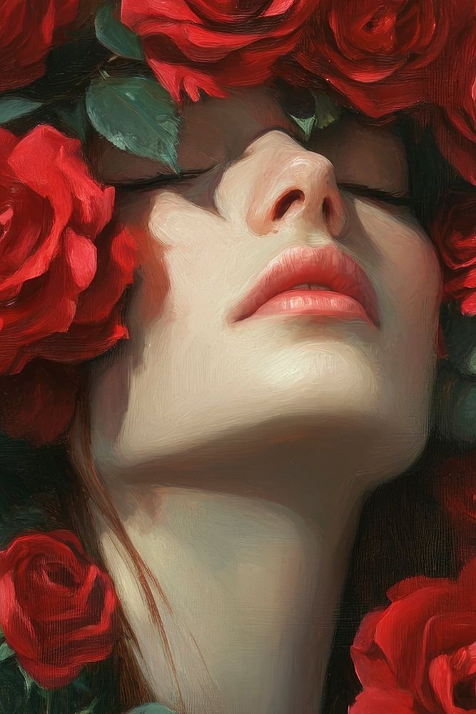 With an aura of passion and graceful beauty, this image captures the essence of romance. The vibrant red roses gently frame the face and add a touch of elegance. Perfect for the bedroom, this artwork creates a dreamlike atmosphere and invites you to linger and dream.