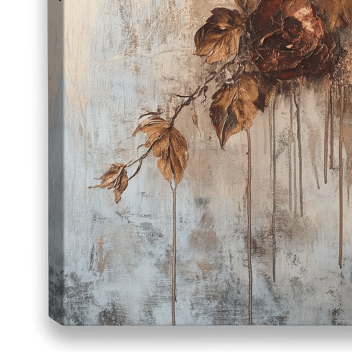 Details: flower painting, rose painting, texture painting, gold leaves, brown leaves, grey background, beige background, nostalgic art,…