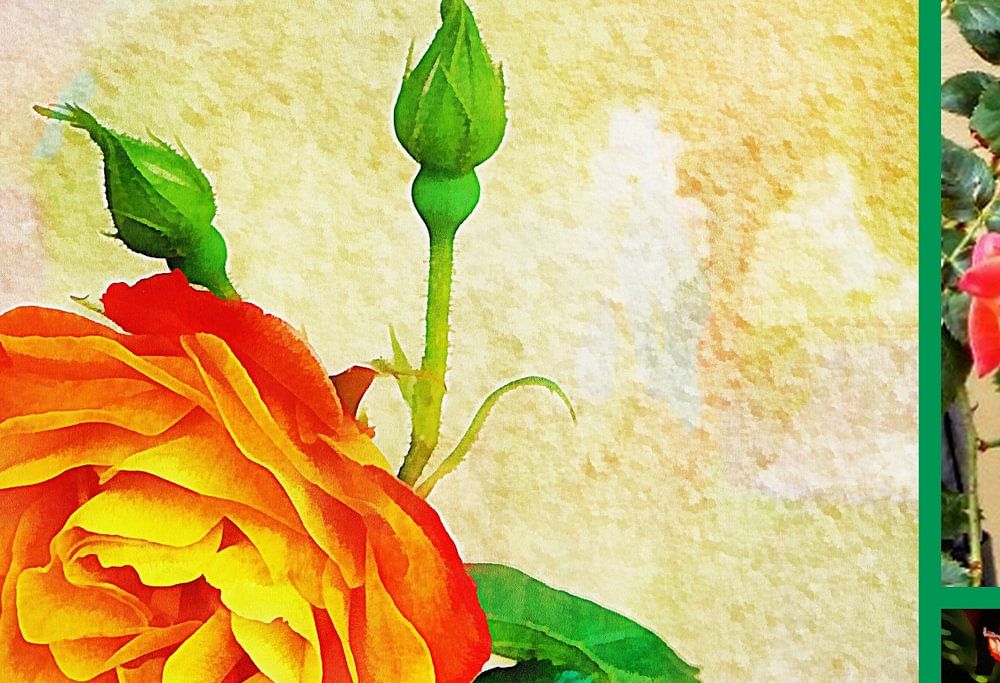 A collage of rose images including orange roses, lilac cascading roses and a quotation about roses by the poet Rumi. "And if you are a rose I am rose shadow". All individual images are created by me from my own photographs and compiled into this collage.