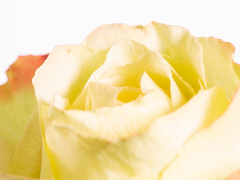 Close-up of a single rose in light yellow and light red against a white background (high key shot)