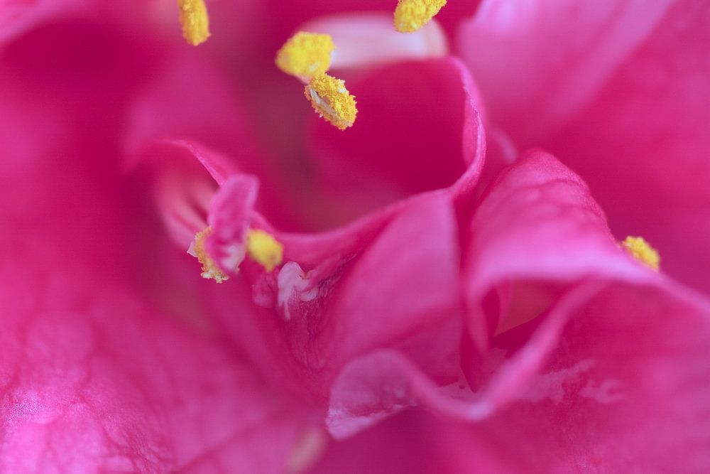 Een close up van het hart en de stuifmeeldraden van Theaceae Camellia Japonica ook wel Winter roos (Rose of winter) genoemd. Deze macro foto toont de schitterende zachte vormen van de bladeren van deze roze bloem.