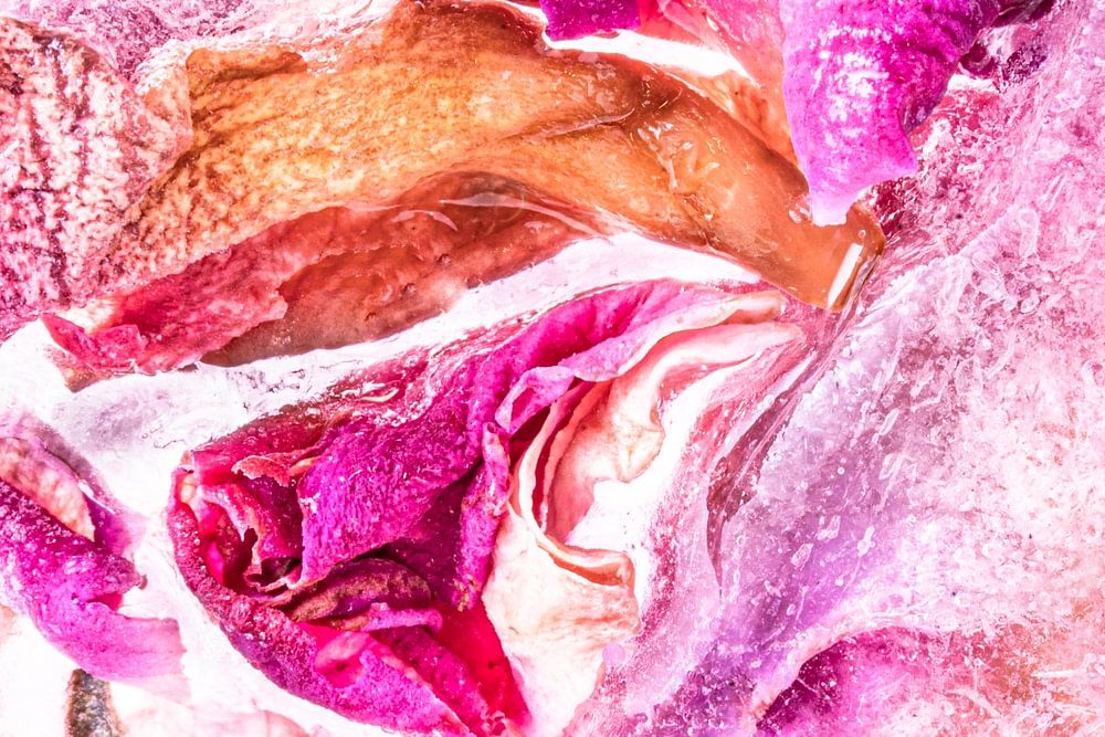 For this photo, rose petals were frozen in water and then photographed with a macro lens.