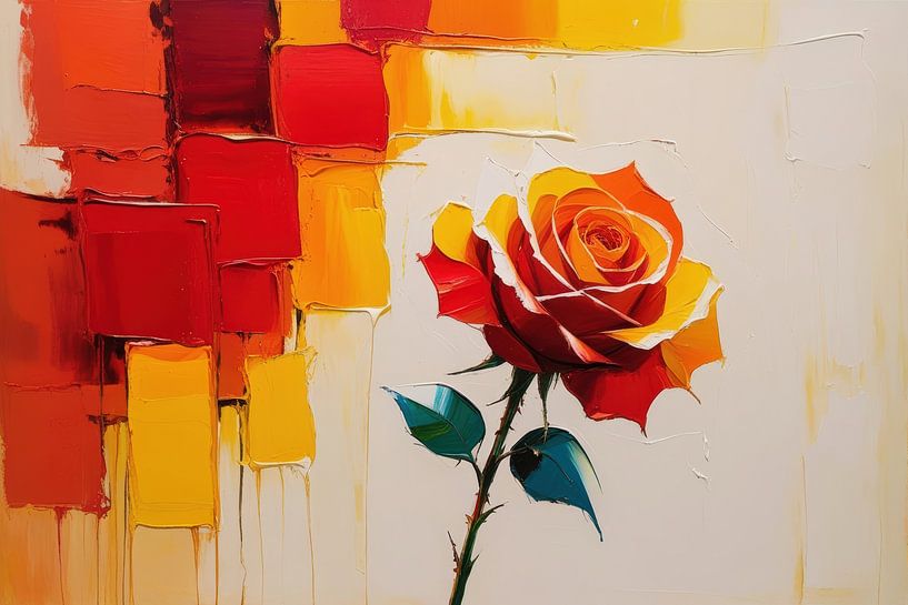 A single rose with red-yellow gradient takes centre stage, surrounded by vertical and horizontal areas of colour in warm tones. Thick impasto strokes add depth and tactile texture, while turquoise leaves provide a fresh contrast against the soft, light background. The composition balances between abstract blocks on the left and organic…