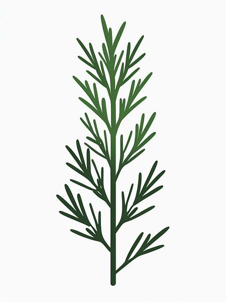 A clean, minimalist illustration of a fresh rosemary sprig featuring narrow, needle-like leaves arranged along a single woody stem in deep green tones. The elegant vertical composition captures the aromatic herb's distinctive appearance against a white background. Perfect for culinary websites, herb garden guides, cooking blogs,…