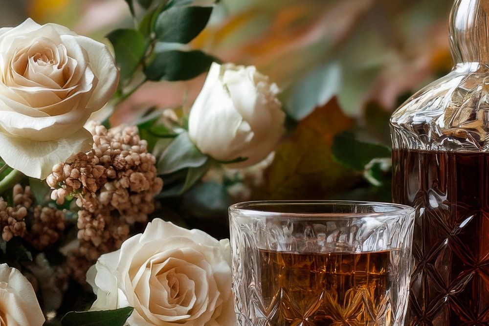 A harmonious duet of fine, petal-white roses and an elegant little glass with golden contents radiates cosiness and style. The soft colours and luxurious shine of the glass lend a warm atmosphere to any room. This work of art is ideal for a living room, where it is an unobtrusive invitation to enjoy and relax.