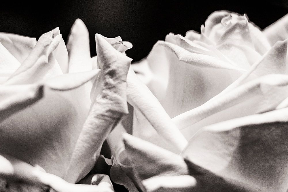 Nearly spent roses in a row in an oblong vase. The conversion to black and white was done with a slight sepia tint to give the photo a little more warmth.