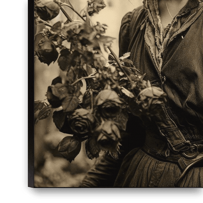 This portrait shows a young woman standing in the centre of an urban setting, holding a bouquet of faded roses in her hands. Her expressive gaze, calm and thoughtful, immediately captivates the viewer. Her slightly tousled hair and understated clothing emphasise her natural beauty and lend her a timeless elegance. The dark, wilted roses…